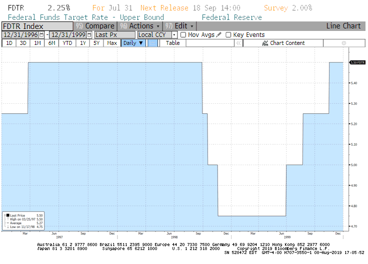 - The Fed began to cut rates in response to an emerging markets crisis (they cut rates 3 times), and fears the economy was slowing down. Equity market weakness in 1998 likely reinforced the Fed’s commitment to ease dramatically. Figure 1 shows that the Fed cut rates sharply in late 1998. The Fed began to raise rates again in late 1999 only after rates rose sharply, inflation rose sharply, and stocks rally sharply.