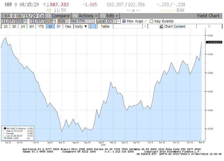 Figure 3: The rise in rates is global. Even yields on 10-year German government bunds are rising sharply. Many investors have viewed the Eurozone economy as dead. As the chart on bund yields shows, fixed income traders are changing their mind quickly. Rates that were sharply negative on bunds are on the verge of turning positive.