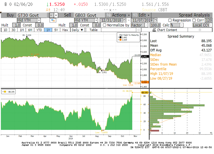 Figure 2: The slope of the US Treasury Yield Curve from T-bills to 30-Year Treasuries is breaking out to new highs for 2019. At the end of August, the yield curve between T-bills and 30-Year Treasuries was actually inverted. On August 30th a 3-month T-bill yielded 1.98% and a 30-Year Treasury yielded 1.96%. So, the curve slope was -2 basis points. The inverted yield curve caused worries about growth. Since that time, the Fed has worked hard to signal accommodation and a commitment to rising inflation. Thanks to Fed rate cuts, the yield on 3-month T-bills has fallen 50 basis points to 1.5%. The yield on 30-year Treasuries has risen over 40 basis points to 2.4%. As a result, the yield curve is now positive with a slope of +90ish basis points. We believe this likely means the Treasury market is pricing that the Fed will succeed in raising inflation expectations (rising growth + rising inflation expectations = steeper curve). This steepening is likely to continue.