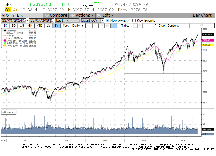 Figure 4. Stocks are breaking out to new highs. The S&P has broken out of a very large trading range. While technicals should always be viewed with healthy skepticism, the dark arts of technical analysis suggest this rally could last a while. This would be consistent with the playbook I have referenced in prior commentaries: namely that the best example from the past to inform this particular moment in market history is 1998. The late 1990’s witnessed an EM shock, Fed easing, a bear steepener, and a surge in stocks, all framed by impeachment proceedings.