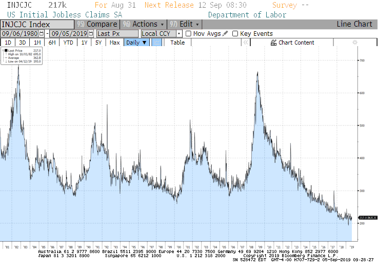 - Today’s report on initial jobless claims shows the jobs market remains extremely strong: jobless claims of 217k remain near the lowest levels in 4 decades (Figure 1).