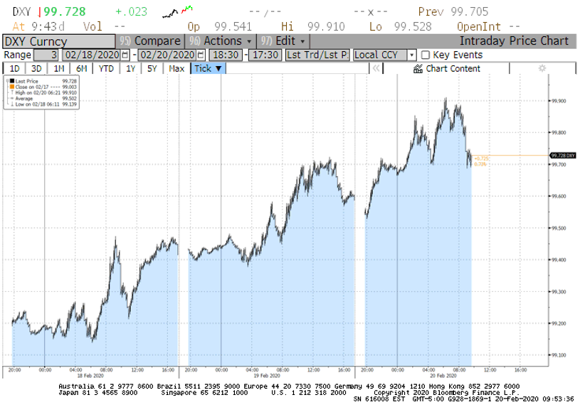 Especially interesting, is the short-term price action in the dollar shown in Figure 2. The dollar has been going up in recent days, and that rally accelerated with the start of the Democratic Debate in Nevada and accelerated during European hours of trading. Investors and FX traders in Asia and Europe seemed to take the dollar higher in response to the debate and as it has hit the top of the trading range, FX traders in NY morning hours appear to have capped the dollar’s rally. Is the dollar becoming a bet on the Presidential election?