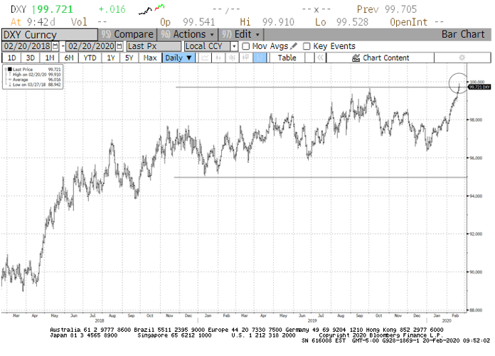 Today, The Wall Street Journal announced that the first weeks of 2020 was the biggest issuance period for foreign currency debt by Emerging Markets companies for the start of a year. Issuance in foreign currencies was $66.4 billion, which is almost double the $34.2 billion issued last year. This is a record level of debt issuance for the first weeks of the year and the fall in global rates was a key catalyst for the surge. 91% of this debt issuance was in US Dollars. This highlights the growing risk to Emerging Market nations for a dollar surge. Certainly, a dollar rally does not lead to an EM crisis – the dollar has been going up for years. Yet, traders (particularly in FX and risk markets) often respond to quick unexpected adjustments in the dollar by trimming risk – let’s see if it happens this time as well should a dollar break-out occur. If the dollar breaks out, and there is no risk-off correction – that will be a powerful signal that risk-on investors are highly confident about their positive outlook for earnings and growth.