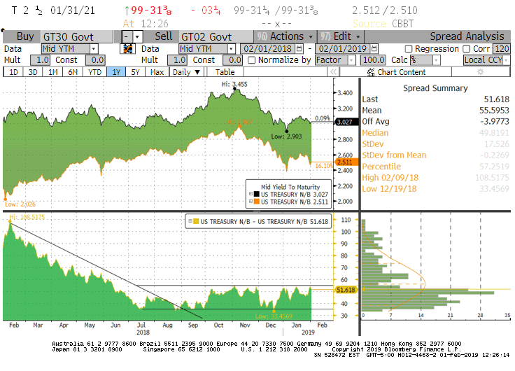 2. We are watching the 2s-30s curve very carefully. As the first chart below shows, the trend to a flatter curve ended in August 2018 and the curve slope has been in about a 20 basis point trading range since that time. If the curve slope steepens convincingly beyond 55 basis points, it could be a good time to move Treasury curve exposure from a barbell to a bullet.