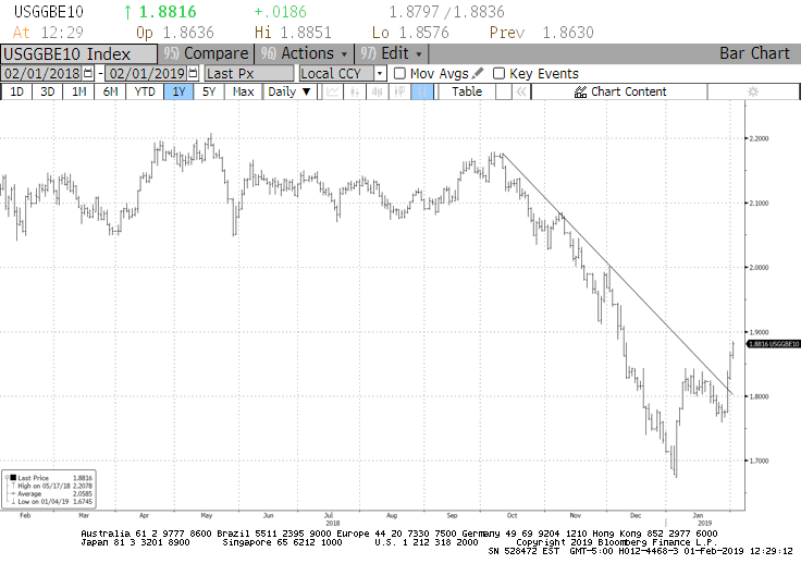 3. We believe the Fed pause is pro-growth and will support higher inflation expectations – we have watched the technicals on TIPS break-evens closely and the downtrend in place since the fall has now been broken. We believe buying break-evens at these levels presents an opportunity. Chart 2 highlights this development.