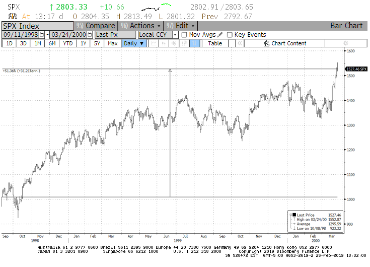 The purpose of this note is not to review that history, but to observe that the release of the Starr report was clarifying. The release of the report and the impeachment proceedings that followed had no impact on financial market performance. In fact, stocks rallied about 50% from the date of the report’s 1998 release to the end of the bull market in 2000. What mattered was the economy, earnings, and Fed policy. And the Fed? It began to ease policy in the second half of 1998 in response to turmoil in EM economies and markets. This was the exclamation point on the bull market of the 1990’s and turbocharged that bull run to its finish. The Fed has yet to ease in 2019, but it has adopted a more dovish posture, the rate hikes are on hold, and balance sheet reductions are likely at the finish line – all signs of greater accommodation. As the famous line goes, history does not always repeat itself, but it sure does rhyme.